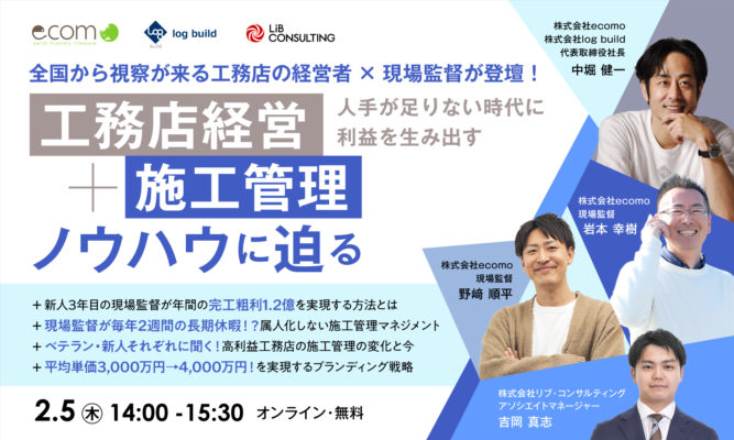 【2月5日(木)開催!!】★現場監督×経営者が語る★新人3年目の現場監督が【年間の完工粗利1.2億】を実現する方法とは?