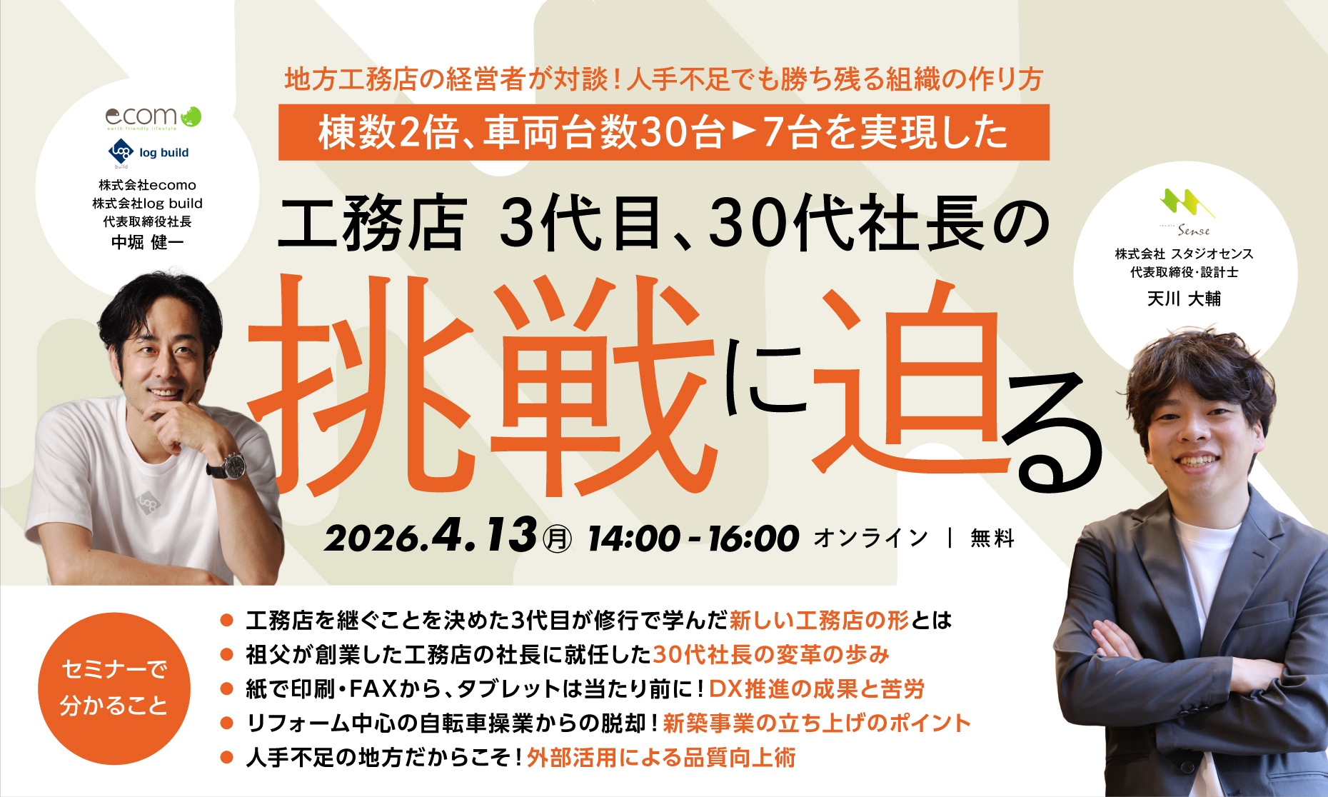 本セミナーでは、山口県の地方工務店であるスタジオセンスの天川社長をお招きし、リフォーム会社から新築事業を立ち上げ、0棟から10棟へ成長させた変革の裏側を公開します。