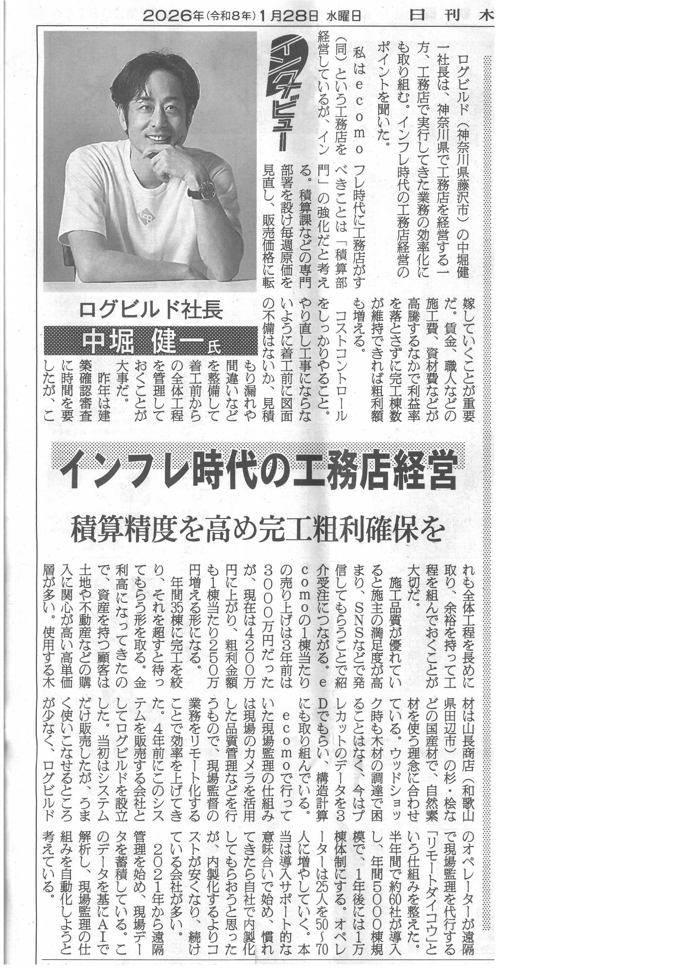 【一般】log build最新情報 1月28日掲載:日刊木材新聞に代表・中堀健一の記事が掲載されました【記事切り抜き有】 Posted on 2026年02月10日2026年02月10日 by log build staff 2026年1月28日(水)発行の日刊木材新聞に、株式会社log build 代表取締役・中堀健一の記事が掲載されました。 今回は、新聞紙面の切り抜きとあわせてお届けします。 ▶記事の見どころ インフレ時代における、工務店経営の考え方 積算精度を高め、完工粗利を確保するための視点 ecomoで実践している施工管理・原価管理の取り組み 下記に記事切り抜きをご用意しましたので、ぜひ、ご覧ください。 『住宅産業大予測 2026』&『ハウジング・トリビューン』最新号に対談記事が2誌同時掲載されました!